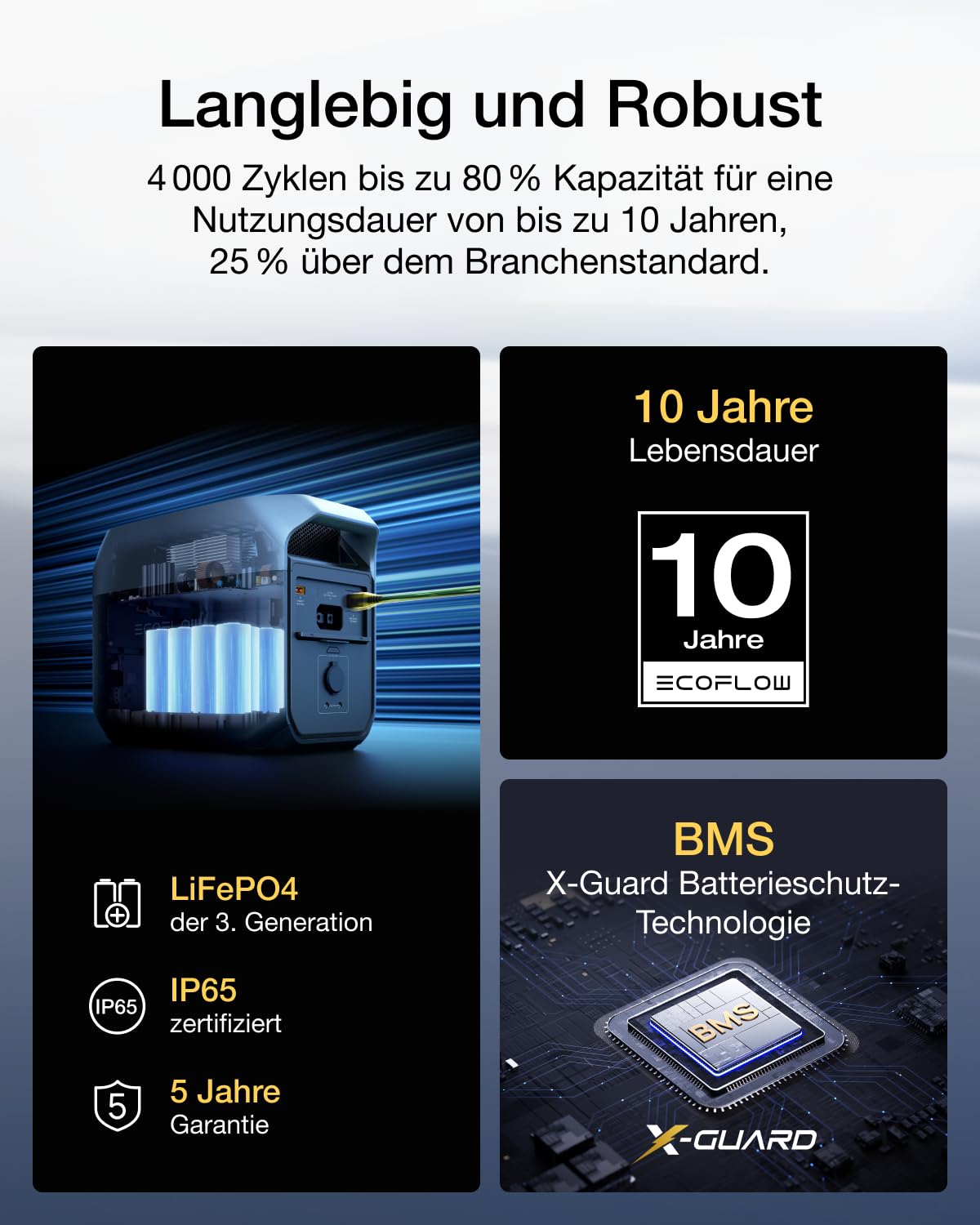 • [DELTA 3 unterstützt DELTA Pro 3, DELTA 2 Max und DELTA 2 Zusatzbatterien und kann auf bis zu 5 kWh erweitert werden. Hergestellt mit robusten LiFePO4-Zellen, die 10 Jahre lang 4 000 Zyklen bis zur Erreichung von 80 % Kapazität bieten. Die IP65 Zertifizierung und BMS (X-Guard Batterieschutz-Technologie) gewährleisten lang anhaltende Leistung und Sicherheit.